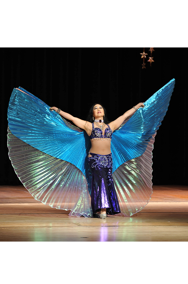 "I’ve been the proud owner of Egyptian costumes by Madame Abla, Madame Hekmet and current designers for Turquoise International – and can attest that these costumes are beautiful and well-made. While on tour in Cairo, Ali took us to Madame Abla’s design studio atelier and we had fittings by the legendary Madam Abla – who just measured us using her hands, making a few designer notes, and creating gorgeous personalized costumes that fit to a “t” within a week. What’s key to good costumes in performance is design elements shape to the body form and work well while dancing. Belt styling and design feature shaping that follows body form. Bra cups and strap placement are both secure, enhance cleavage, while providing comfortable support in a stylish manner."