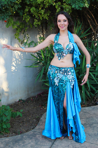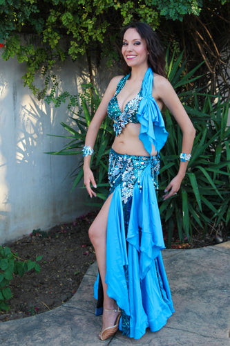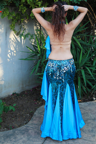 This lovely costume has a full circle and half skirt with built in shorts.This costume was hand-made in Egypt for Turquoise International. It is one-of-a-kind. All measurements are the largest...